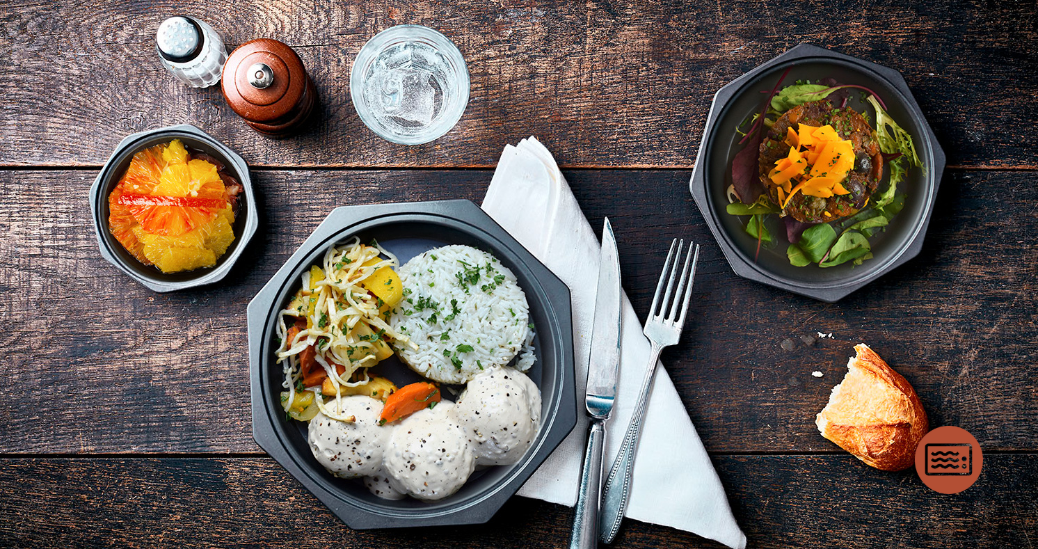 Boulettes de poulet, sauce au poivre, panais et carottes rôtis au four, riz pilaf