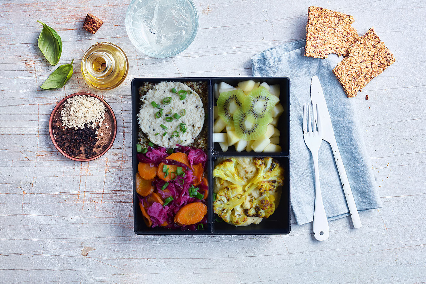 Rillettes classiques de truite accompagnées de quinoa et de chou rouge en salade