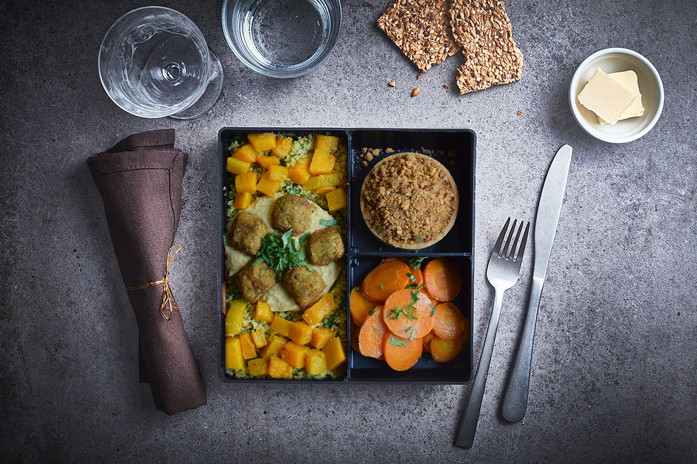 Falafels et potiron rôti au ras el-hanout sur son lit de boulgour aux herbes