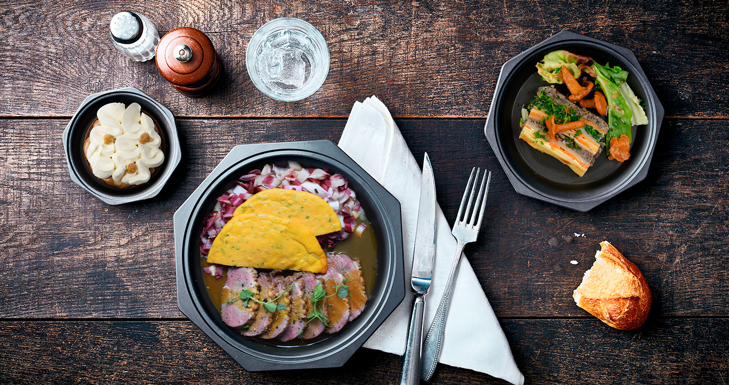 Notre version du canard à l’orange, petite crêpe de patate douce, endives en salade
