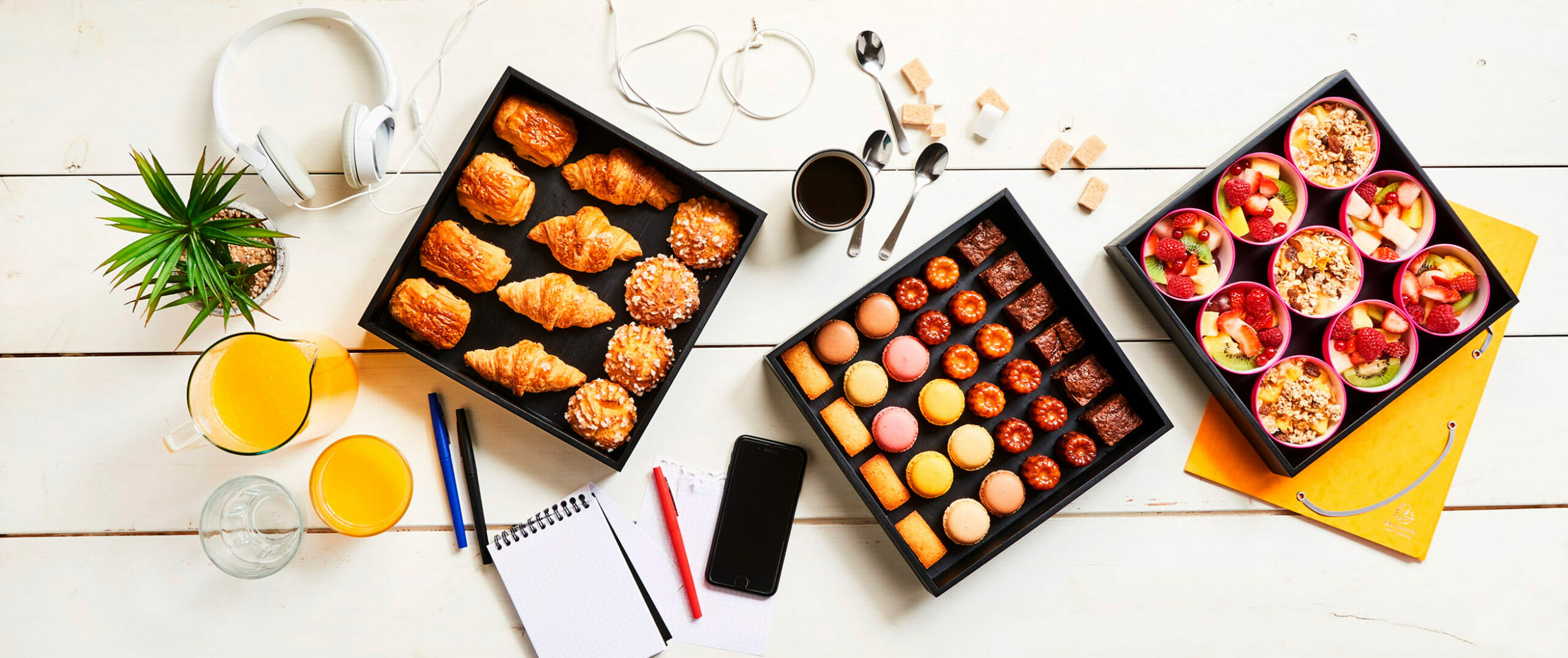 Jus d’orange pressé frais 25cl – Brochettes de fruits – Pause – 3 pièces: Mini Brownie, Financier, Cannelé