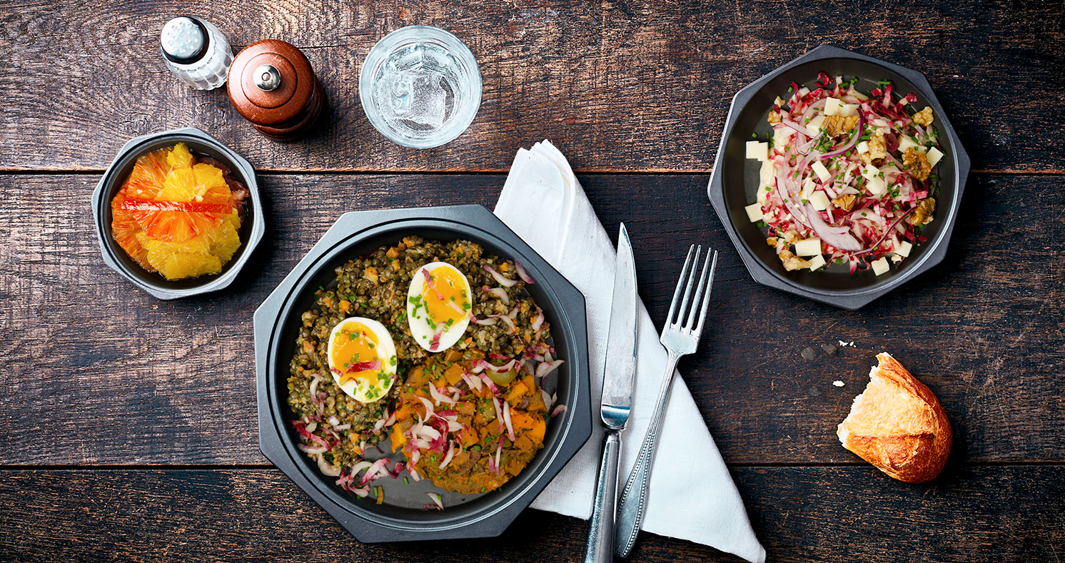 Ratatouille sicilienne de courge, œuf mollet bio et lentilles cuisinées